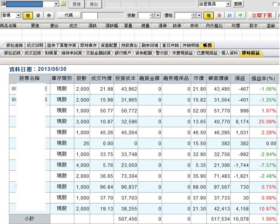 5/22開始,指數從高點8439.15開始下跌,我從5/17開始就調節部位,一直減碼到今天為止,我持有現貨的投資比重仍佔此證券帳戶的20%左右(可能有人會覺得我減碼速度很慢)。這一路跌下來,我的運氣算好,透過換股及停損,5/17~5/30這段時間帳戶小賺小賠,昨天的量化交易日報有提供這段時間我的交易紀錄,可以看到我這段時間出場的部位及價格(要向沒訂閱的人說聲抱歉,因為網路上不方便貼出個股的名字,免得造成不必要的麻煩)。下圖是我今天收盤後的即時持股狀況。